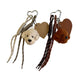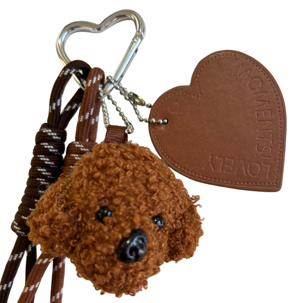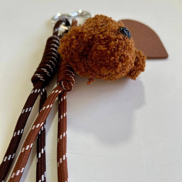 Agrega un toque adorable a tu cartera con este charm de oso en cafe y cintas en tonos tierra.