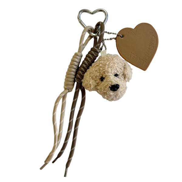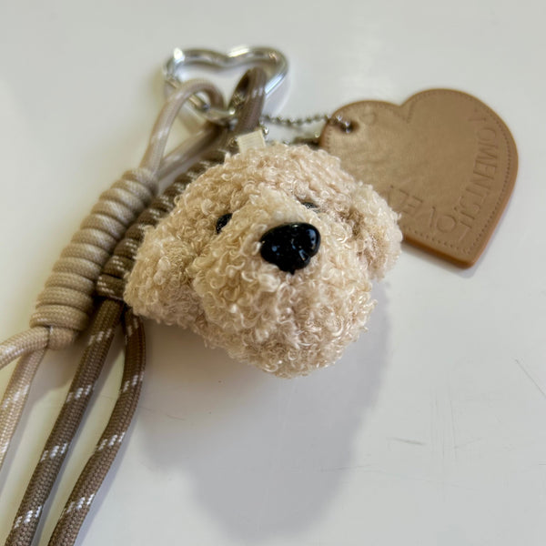 Agrega un toque adorable a tu cartera con este charm de oso en beige y cintas en tonos tierra.